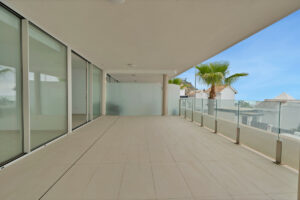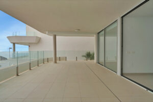 La gran terraza en forma de L que rodea el apartamento proporciona impresionantes vistas panorámicas al mar y un amplio espacio para relajarse y comer al aire libre.